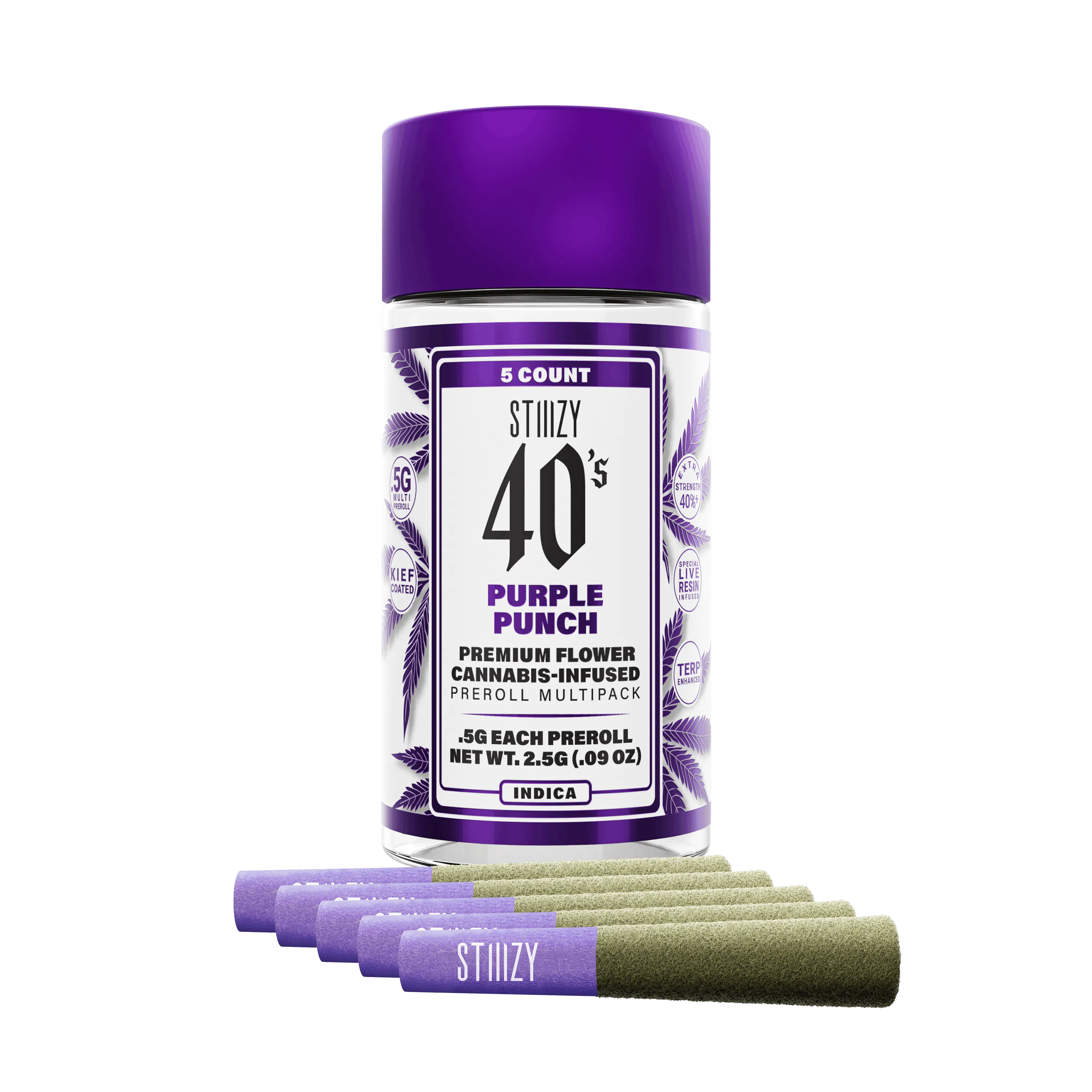 Stiiizy is setting the standard in the pre-roll game with the most revolutionary and innovative products. Elevate your pre-roll game. Stiiizy 40s pre-rolls are setting the standard with high potency, cannabis infused joints coated evenly with kief. Using our proprietary live resin infusion methods, we’ve designed every pre-roll to offer 40%+ THC potency with a unique flavor profile. With a smooth inhale and tasteful exhale, each and every Stiiizy 40 is packed with indoor grown flower, specifically made to ensure a potent and long-lasting high. Spark up the 40s.